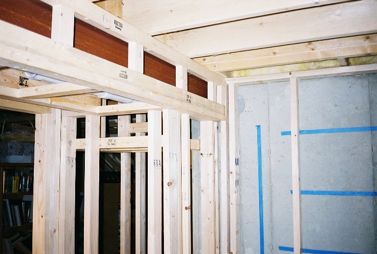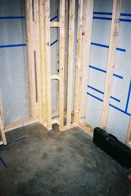 One of the last things I did in the rough-framing stage was to build and attach the corners of the room. Once this is trimmed, it will give the appearance of build-in sunken custom shelving.