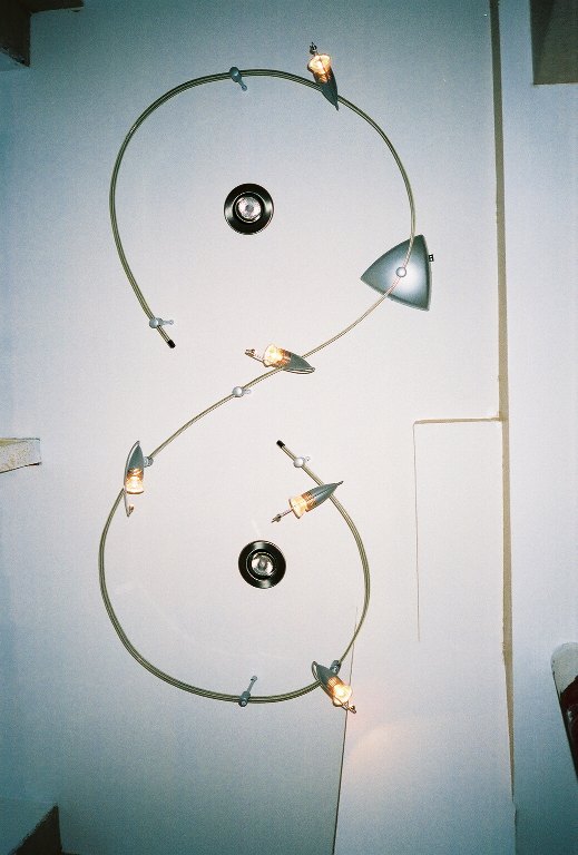 Looking straight up from the left side of the room, you'll see the lighting fixtures. The track lighting provides direct task lighting towards the built-in shelves and the two recessed directional lights in the center provide soft ambient lighting to the room.
