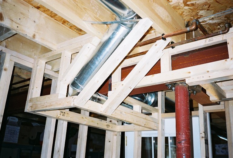 Here's a more complicated soffit frame. I didn't want to loose a lot of headroom space, so I conformed to the angled ventilation pipes and I-beams as close as posslble.